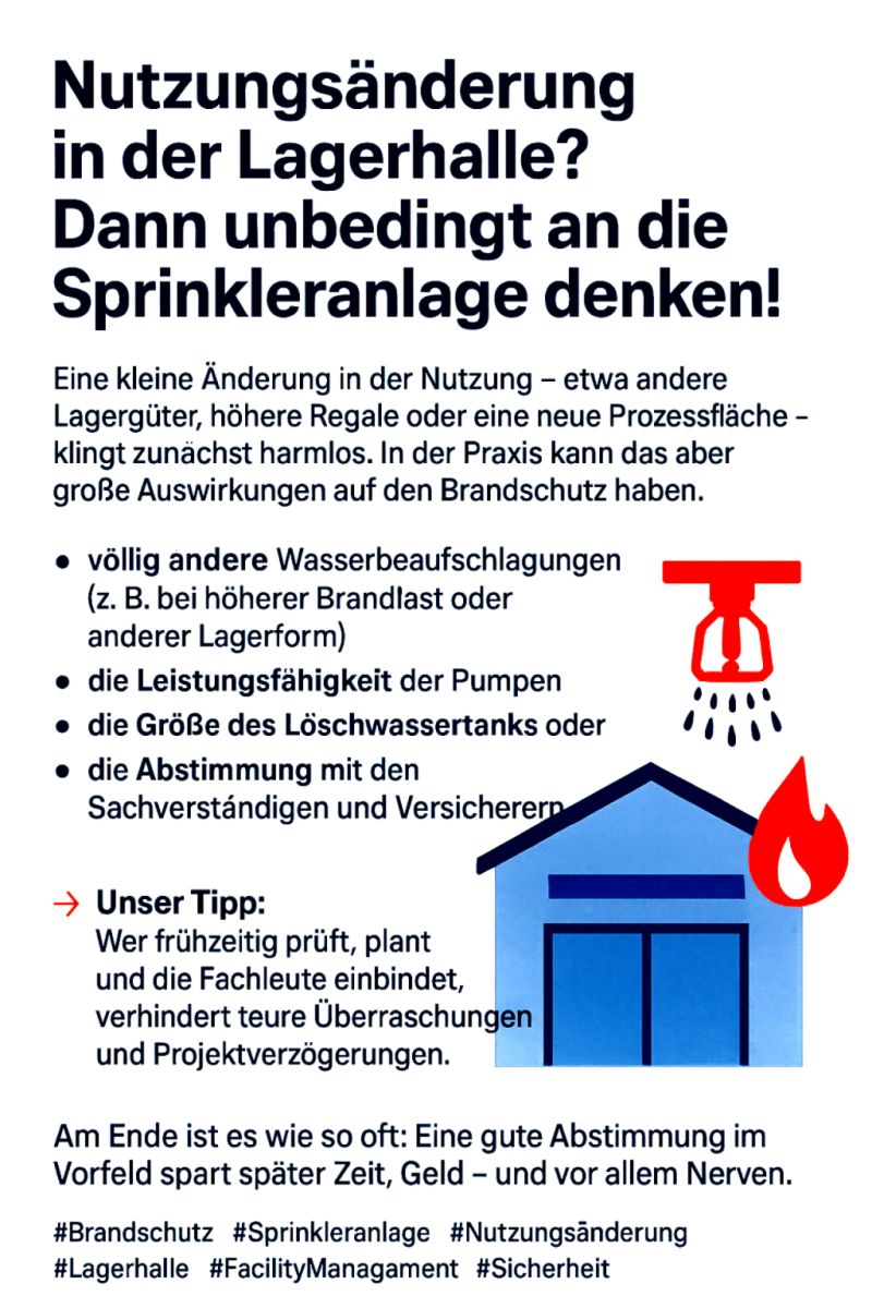 #Brandschutz #Sprinkleranlage #Nutzungsänderung #Lagerhalle #LöschConcept #Löschanlagenplanung #Sicherheit #Industrie